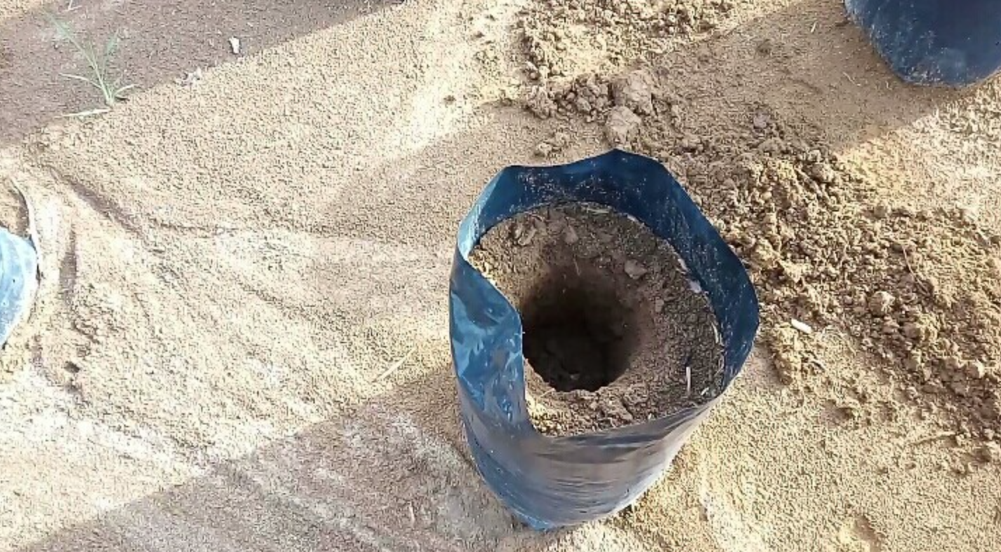- Buat lubang ditengah polybag dengan menggunakan alat pelubang yang sudah dipersiapkan. Kedalaman lubang dibuat ±20 cm atau disesuaikan dengan tinggi tanah di polybag kecil